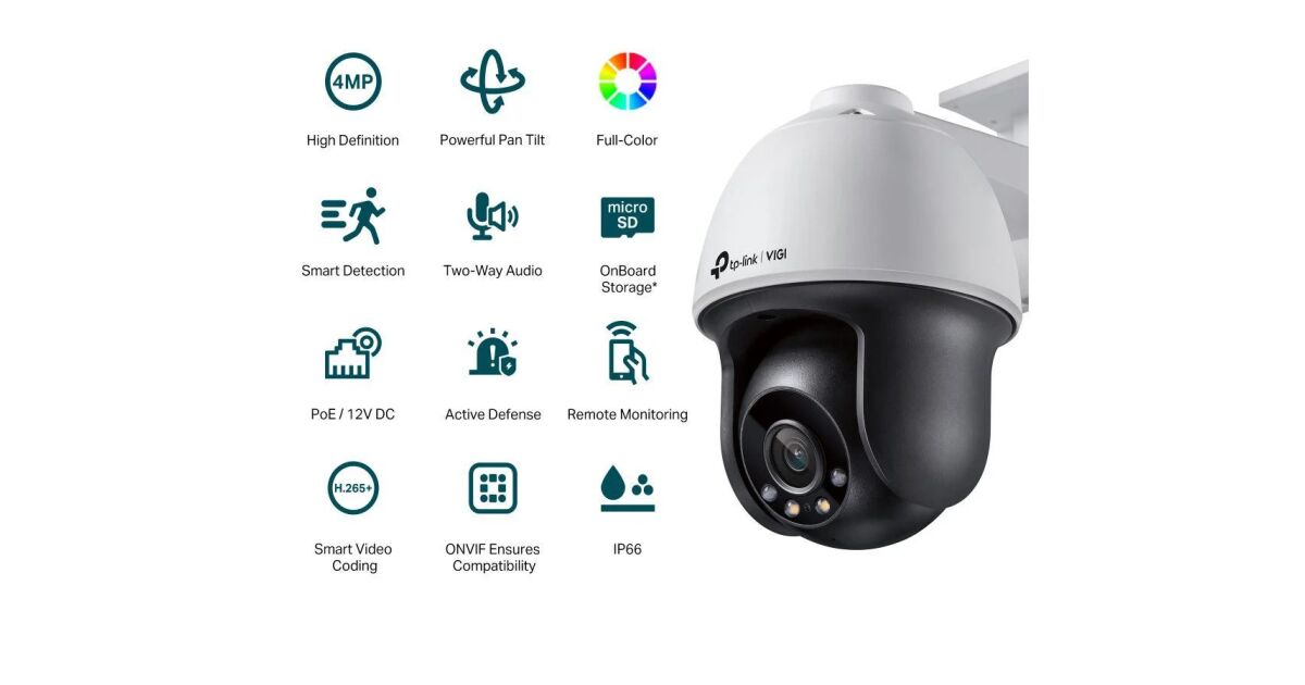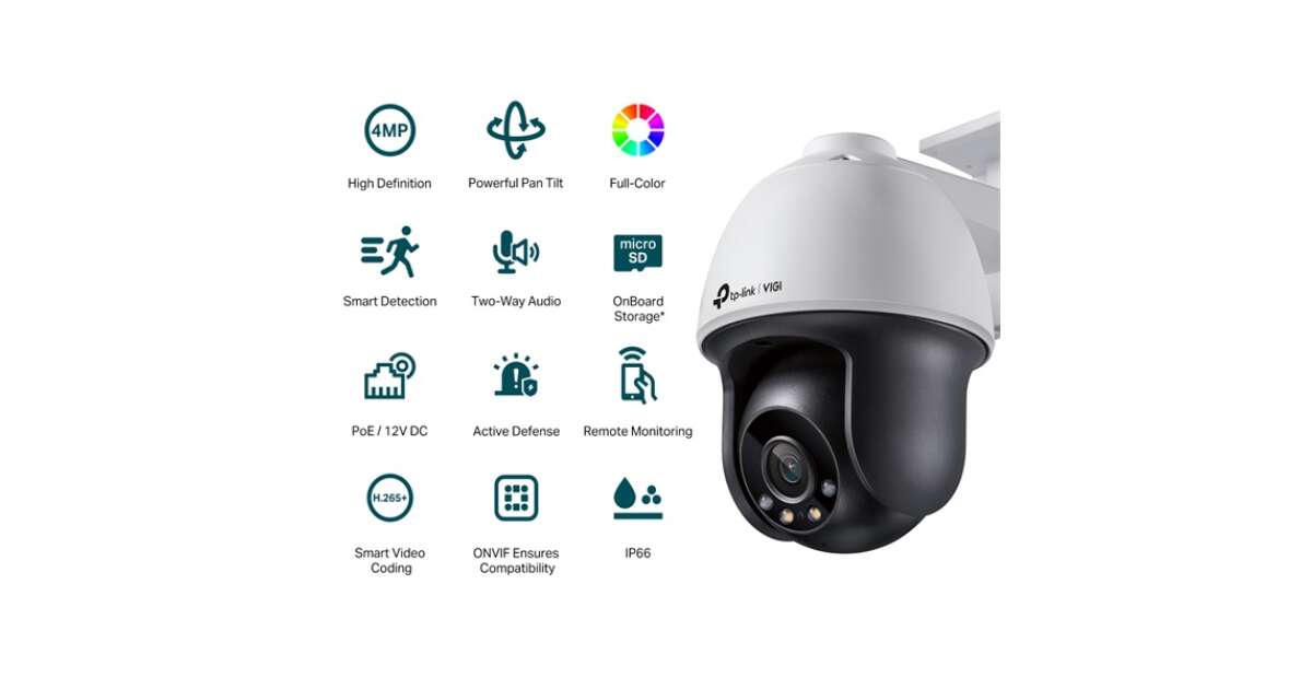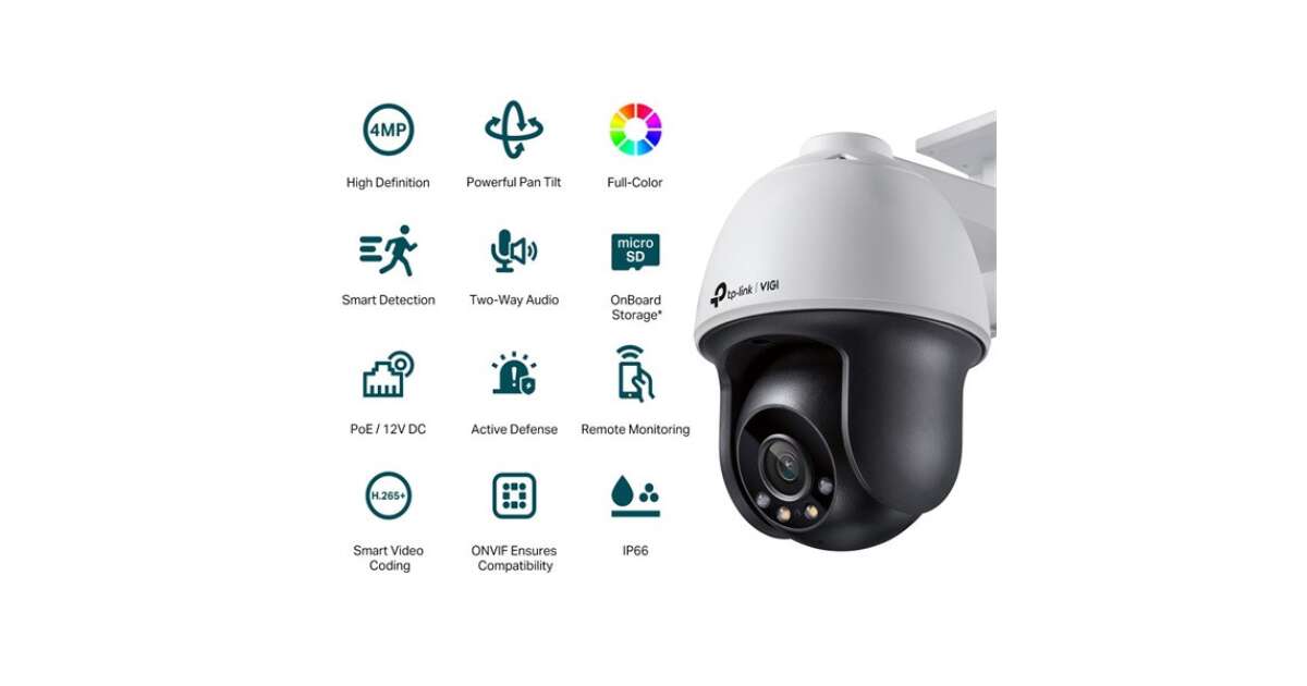 Това е TP-Link VIGI C540 4MP външна PTZ камера, отличен избор както за дома, така и за бизнеса. Благодарение на 4-мегапикселовата резолюция и инфрачервеното нощно виждане, работещо и в пълна тъмнина, тя осигурява кристално чиста картина както през деня, така и през нощта. Функцията панорамно завъртане и накланяне (PTZ) ви позволява лесно да наблюдавате желаната зона.