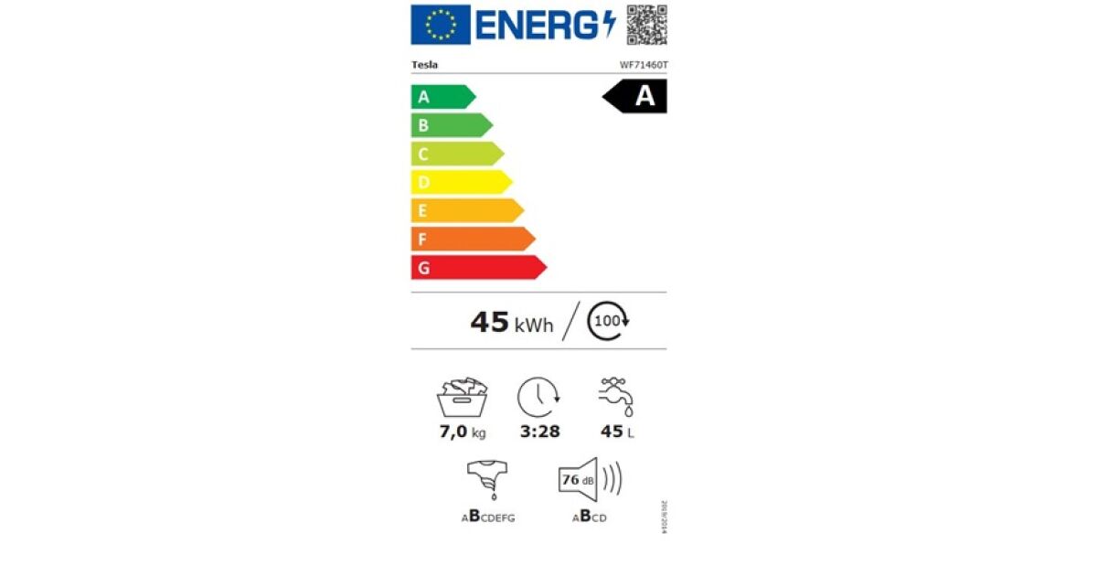 Пералня Tesla WF71460T с предно зареждане, 7 kg, 1400 об./мин, 16 програми, Енергиен клас A