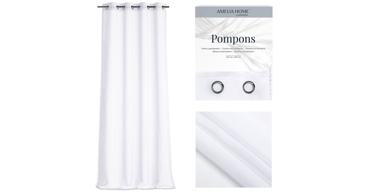 Бялата воална завеса AmeliaHome Pompons е перфектният избор, ако търсите светло, ефирно и стилно допълнение към вашия дом. Финният воал украсен с помпони нежно филтрира светлината, създавайки приятна атмосфера във всяка стая.
