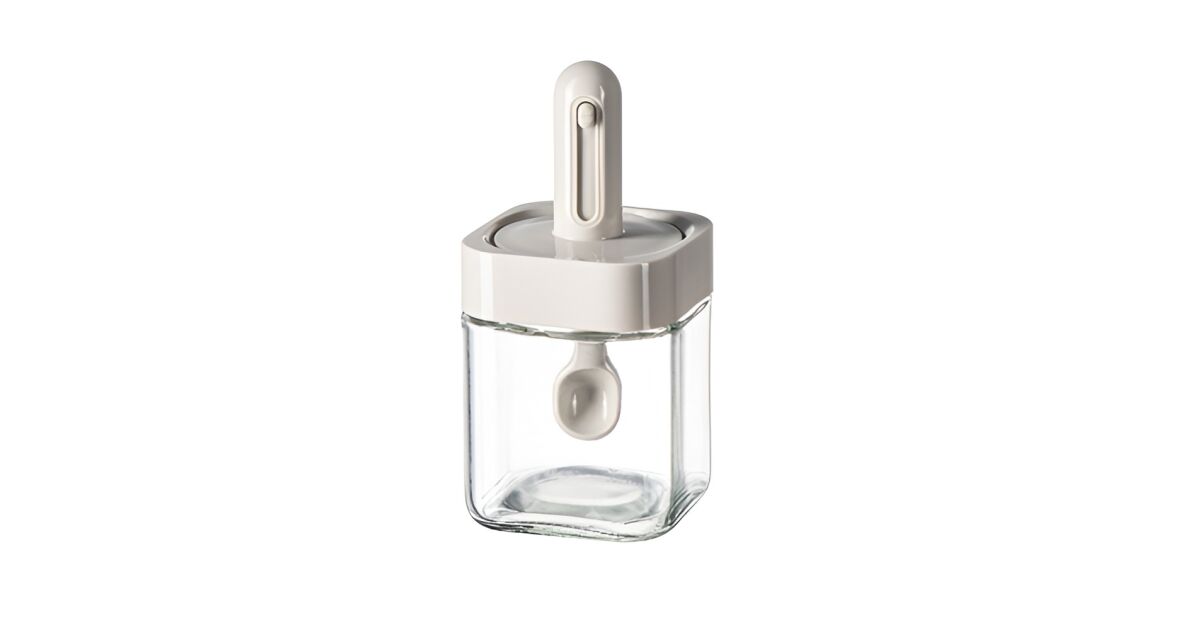 Контейнер за съхранение на подправки, KeepHome, стъклен буркан, вграден капак и лъжица, домакински, 300 ml, 7.1x7.1x14.8 cm, сив описание на...