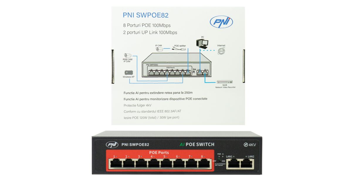 PNI POE комутатор SWPOE82 8 POE порта 100 Mbps и 2 UP Link порта 100 Mbps, 120W, функция AI Extend до 250 м, 4kV мълниезащита описание на...