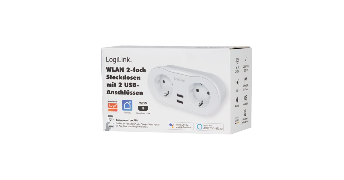 Priza inteligenta LogiLink SH0102, Wi-Fi, 2 prize, 2x USB-A 5 V/2.4 A (max. 12 W), protectie supracurent/supratensiune, IP20 compatibil Tuya, Alb