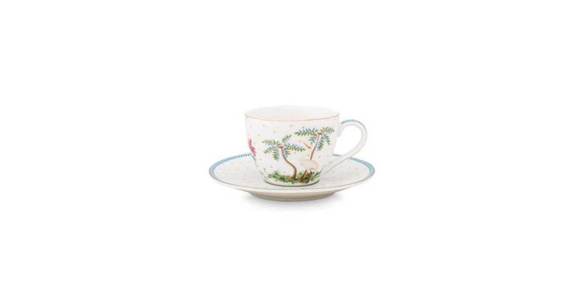 Насладете се на моментите, в които пиете кафе или чай с този красив порцеланов комплект от 2 чаши и чинийки от колекцията Jolie White на Pip Studio! Елегантният дизайн, вдъхновен от тропически пейзажи, ще внесе малко ваканционно настроение във вашия дом всяка сутрин.