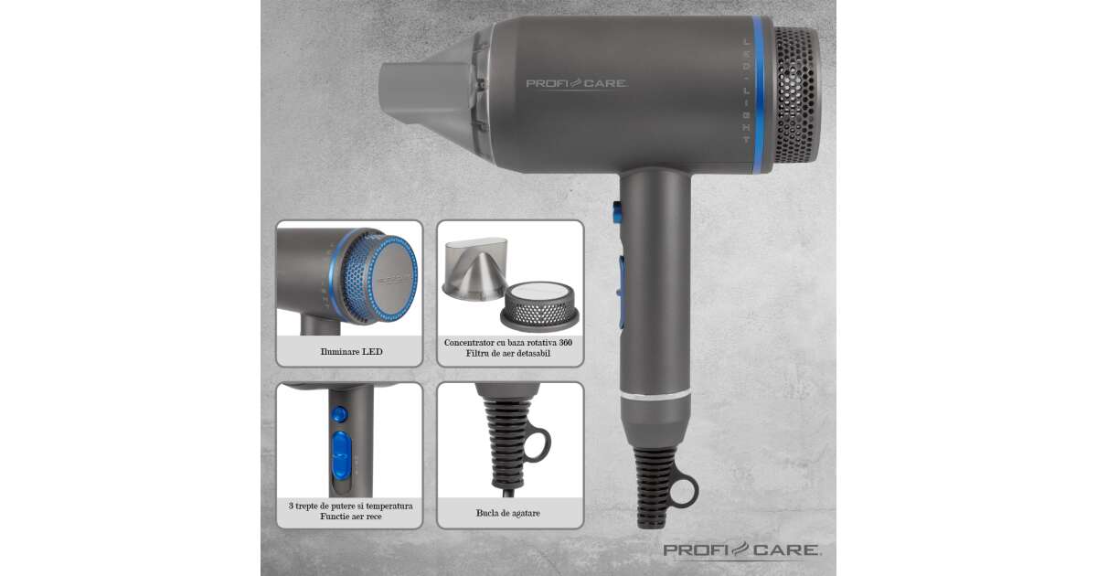 -Сешоар ProfiCare, PC-HT3082, 1800 W, йонизираща функция, 3 степени на мощност, защита от прегряване, концентратор с магнитно захващане, LED светлина, сив