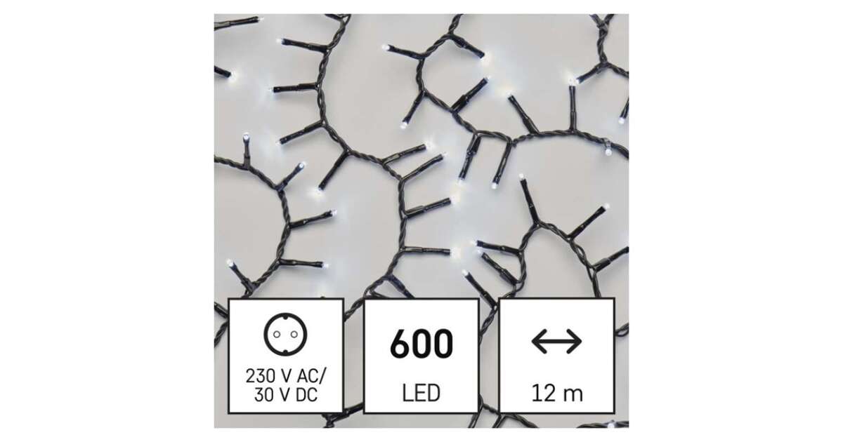 Създайте блестяща, празнична атмосфера във вашия дом и градина с този 12-метров LED коледен гирлянд! 600 студено бели LED светлини се грижат за вълшебните светлини, които създават приятна, уютна атмосфера. Благодарение на вградения таймер, той се включва и изключва автоматично, така че не е нужно да се притеснявате за това.