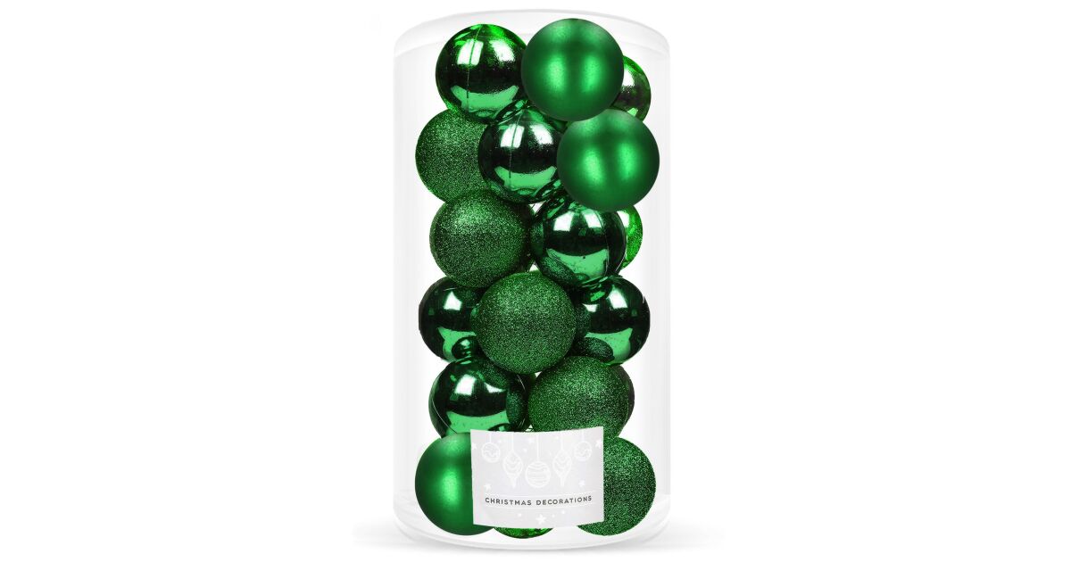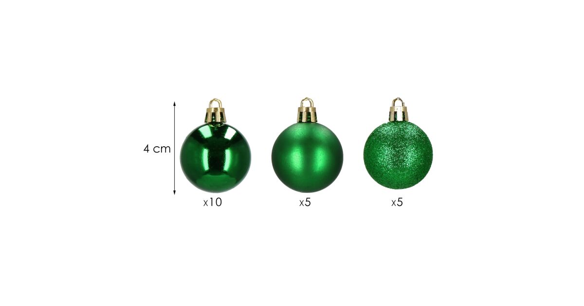 С този комплект от 20 бр. зелени коледни топки с размер 4 см лесно можеш да украсиш своята коледна елха! В комплекта ще откриеш топки с различно покритие, което ще придаде разнообразен и вълнуващ вид на дървото.
