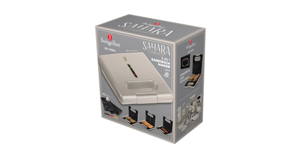Машината за сандвичи, грил и гофрети с 3 в 1 сменяеми вложки е част от колекцията Sahara, която е от съществено значение за модерните кухни. Този универсален уред не само улеснява ежедневното готвене, но и със стилния си дизайн може да бъде украшение на кухненския плот. Всички части от колекцията Sahara имат унифициран дизайн, така че могат да бъдат изложени на показ, без да се налага да бъдат скрити в чекмедже.