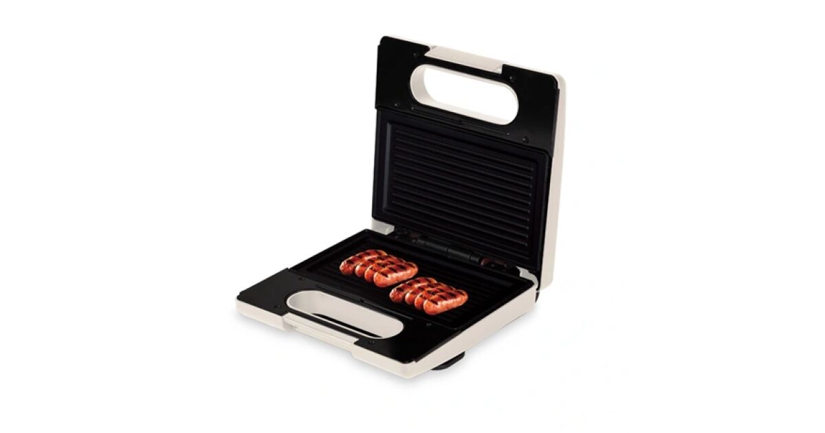 Характеристики: - Материал: алуминий, бакелит - Мощност: 780 W - Напрежение: 220-240 V, 50/60 Hz - Размер на плочата: 22,5 x 13 cm - Незалепващо покритие - Цвят: матиран крем - 3 вида подвижни тави за различни видове храна: грил, сандвич, вафла - Хладна на допир външна повърхност - Светлини за включване и готовност - Автоматичен контрол на температурата, защита от прегряване - Крачета против хлъзгане - Предпазен заключващ лост (лесно затваряне)