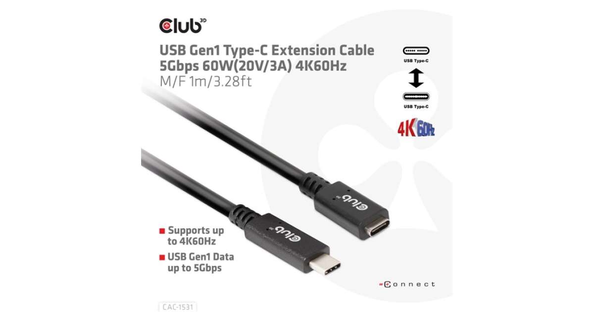 CLUB3D USB C GEN1 EXT CABLE 5GBPS 4K60HZ M/F 1M USB кабел 1 м 2 x USB C (CAC-1531)