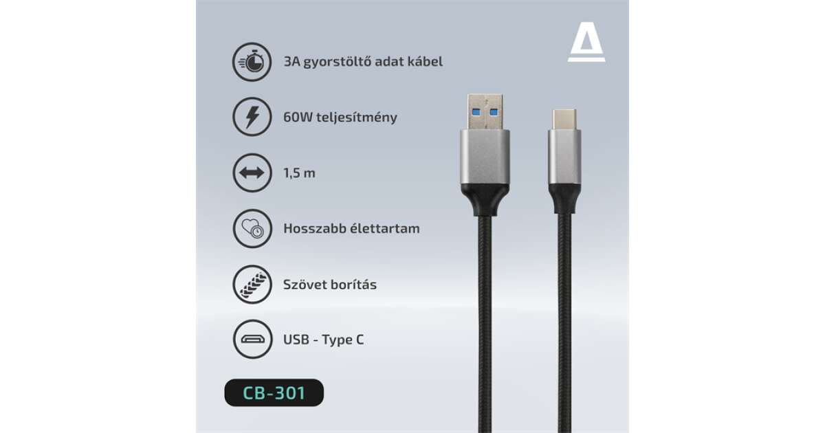 -AVAX CB301G STEELY USB A-Type C 60W бързо зарядно устройство, кабел с усукана двойка, 3A, стоманено сив - 1,5 м