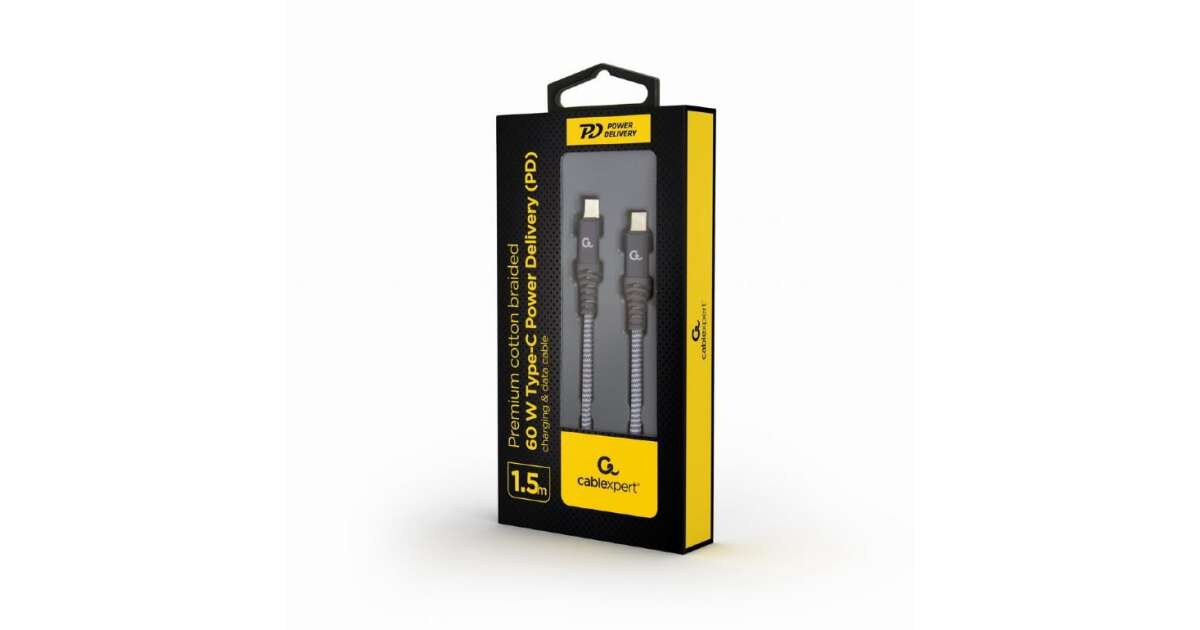 Gembird, 60W Type-C Power Delivery (PD), премиум кабел за зареждане и данни 1,5 м, сив, CC-USB2B-CMCM60-1,5M (CC-USB2B-CMCM60-1.5M)