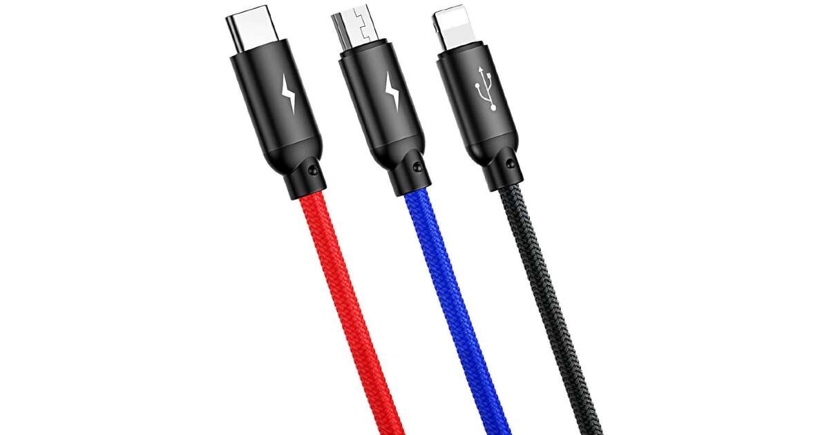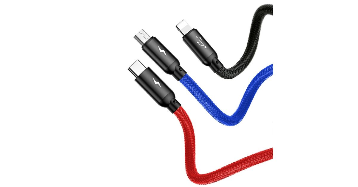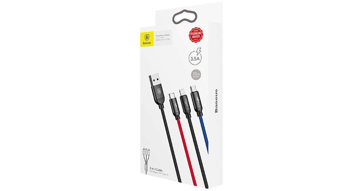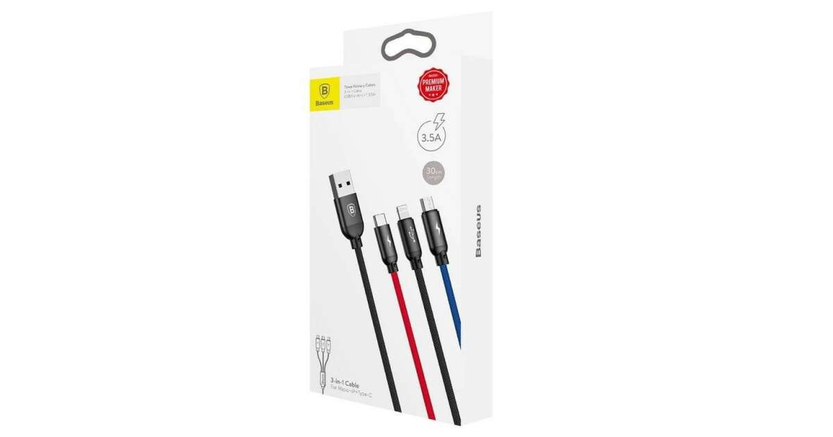 Този практичен кабел Baseus може да зарежда три различни устройства едновременно: с USB-C, Lightning и Micro USB конектори. Различните цветове на кабелите ги правят лесни за разграничаване.