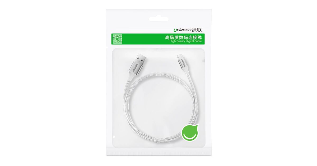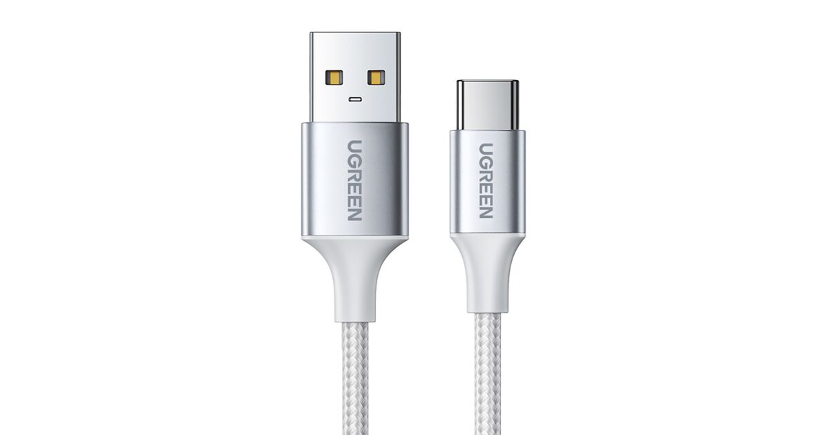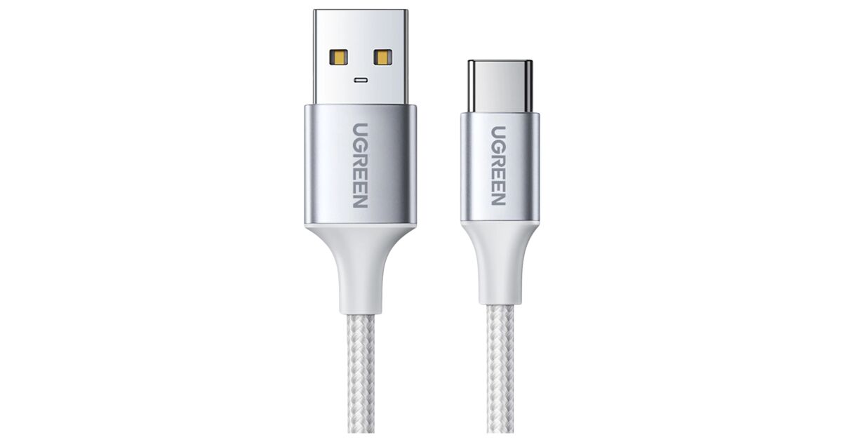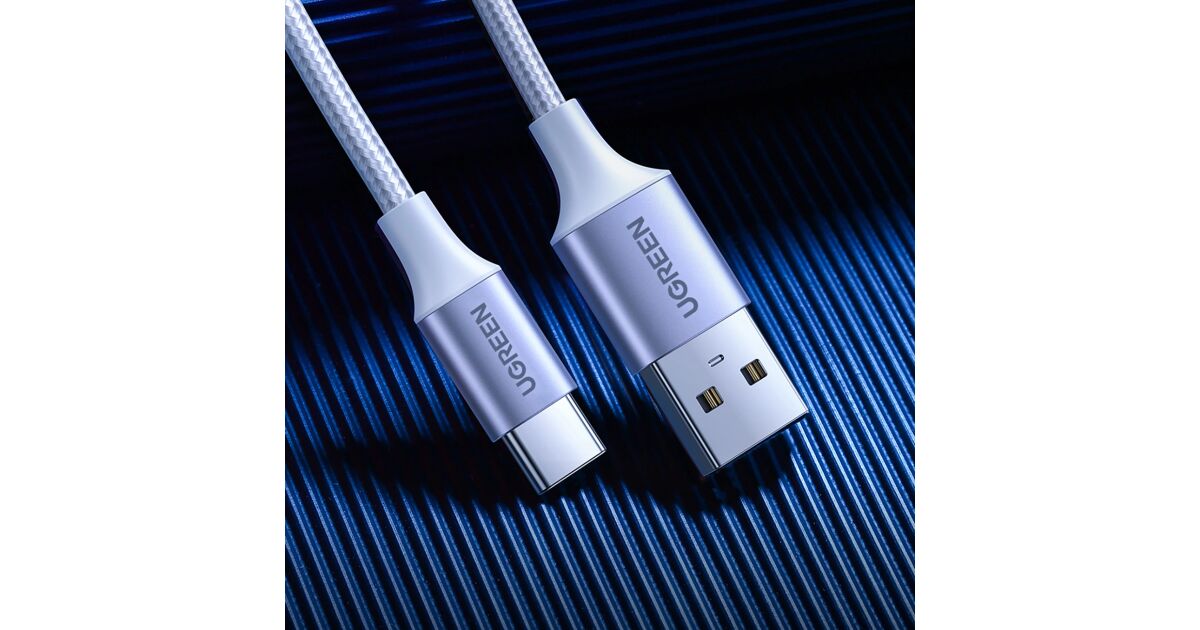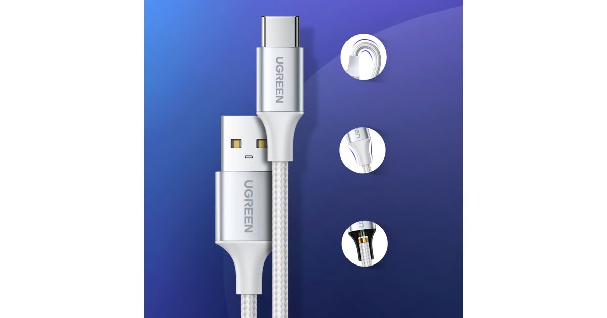 Кабел за зареждане и данни Ugreen, Fast Charging, USB към USB Type-C, 3A, Nickel Plating, Braided, 1.5 м, Бял (ugr60132) описание на...