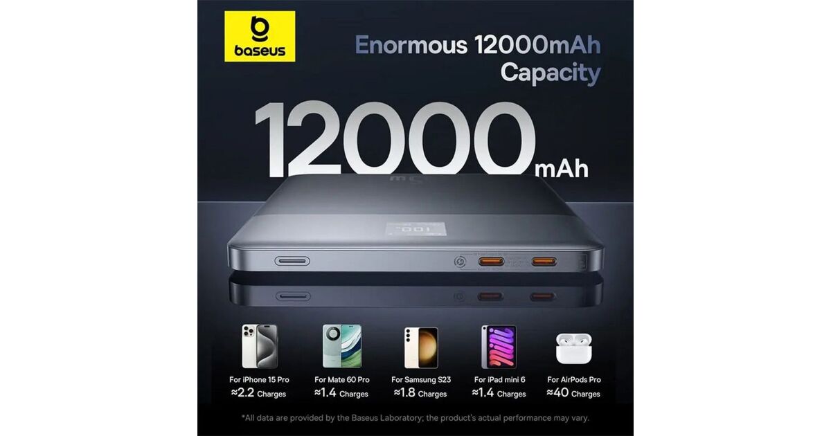 Външна батерия Baseus Blade 2 12000mAh, 65W, 2x USB-C, Бързо зареждане, Ултратънък, сребро описание на...