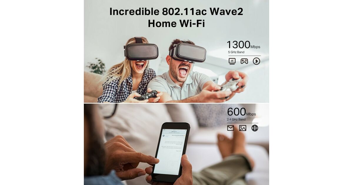 - AC1900 Dual Band: 1300 Mbps (5 GHz) + 600 Mbps (2.4 GHz) скорост