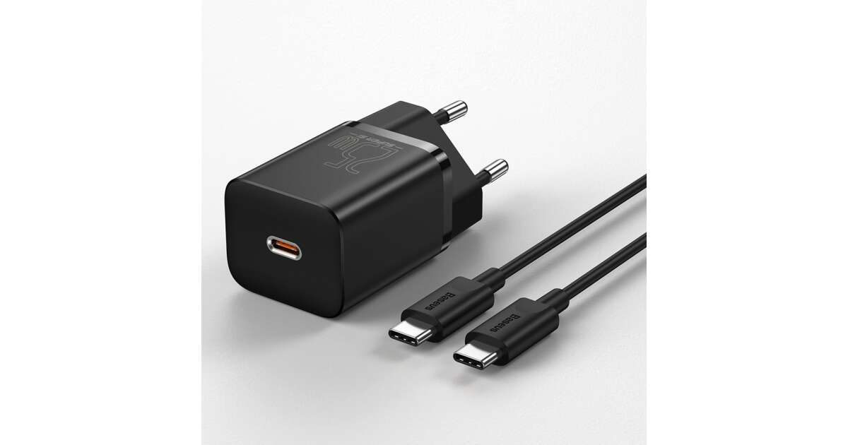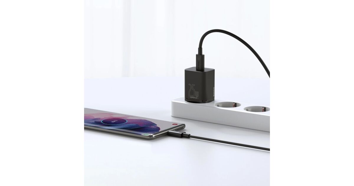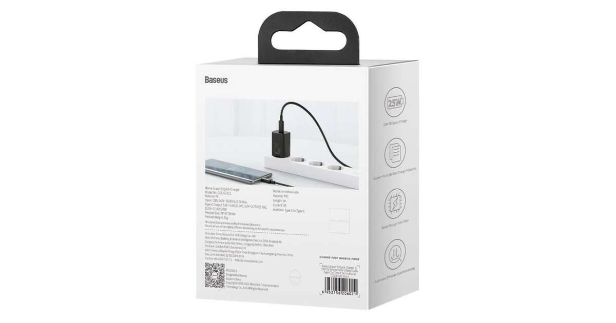 Baseus Super Si 1C 25W бързо зарядно устройство с 1 м USB-C-USB-C кабел (черно) описание на...