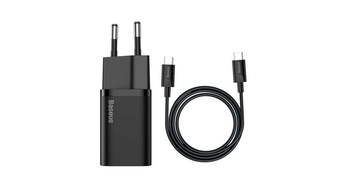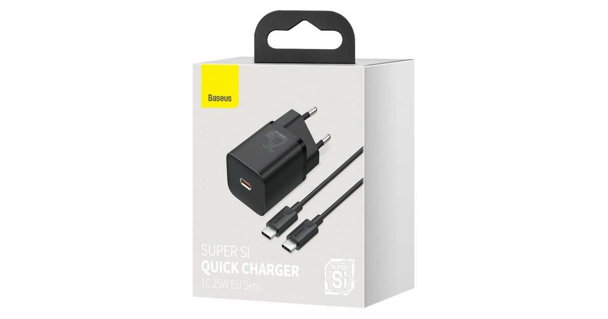 Baseus Super Si 1C 25W бързо зарядно устройство с 1 м USB-C-USB-C кабел (черно)
