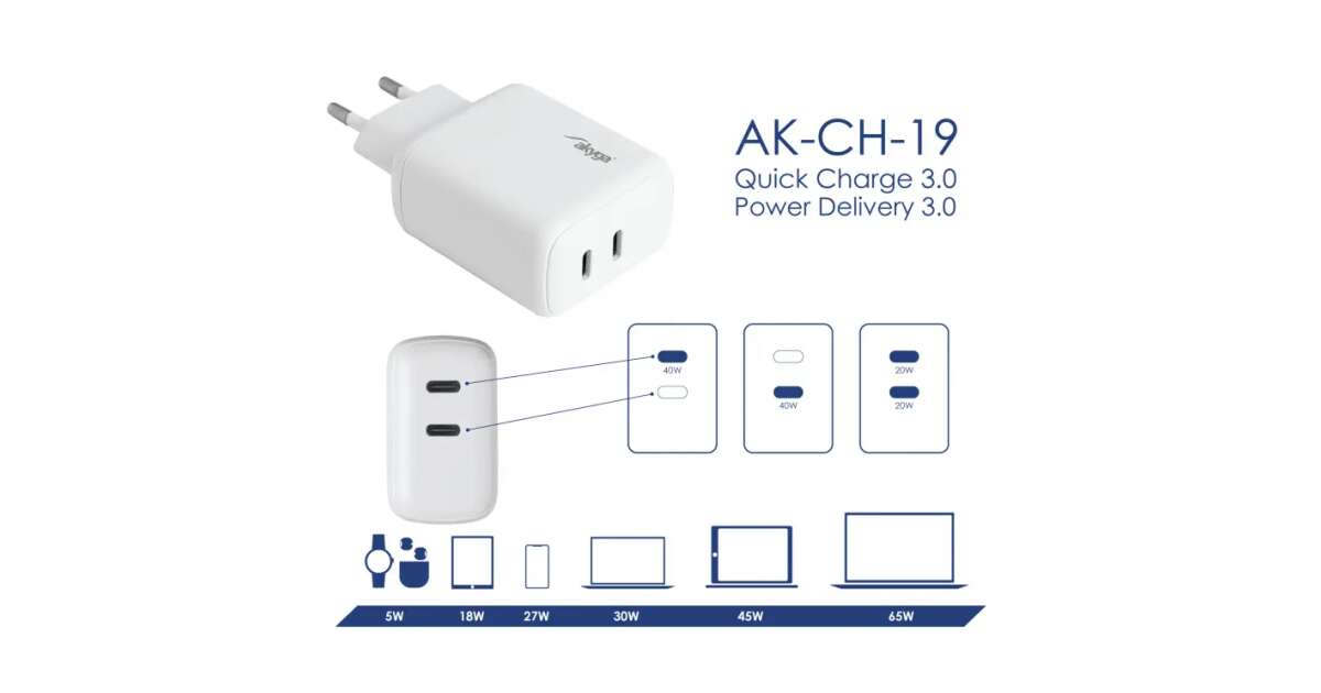 -Akyga AK-CH-19 2xUSB-C PD Quick Charge 3.0 5-12V / 1, 67-3A 40W Бяло, Зарядно (AK-CH-19) описание на...