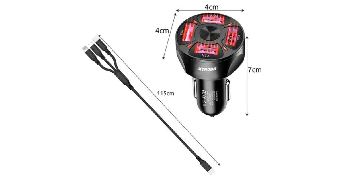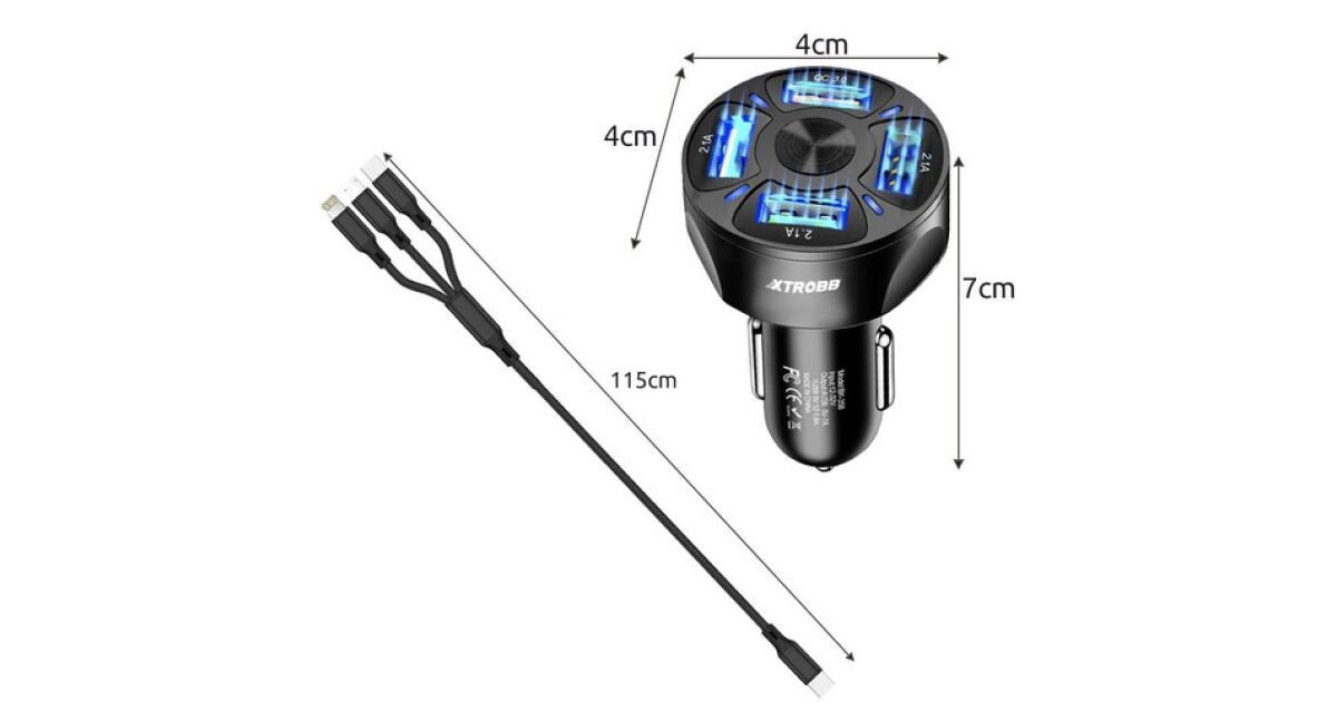 LED зарядно за запалка, 4xUSB 3.0 + micro USB, тип C + кабел - XTROBB описание на...