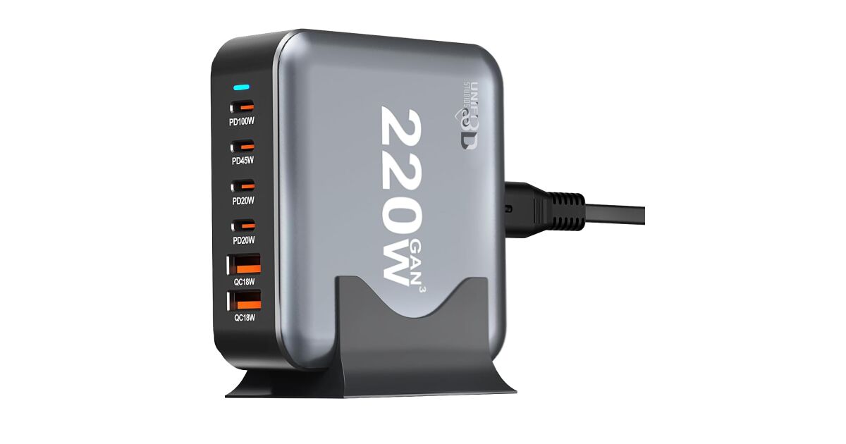 6-в-1 зарядна станция GaN III – 220W, 4x USB-C + 2x USB-A | Едновременно зареждане на лаптоп и телефон | Съвместим с MacBook, таблети, смартфони | Черен