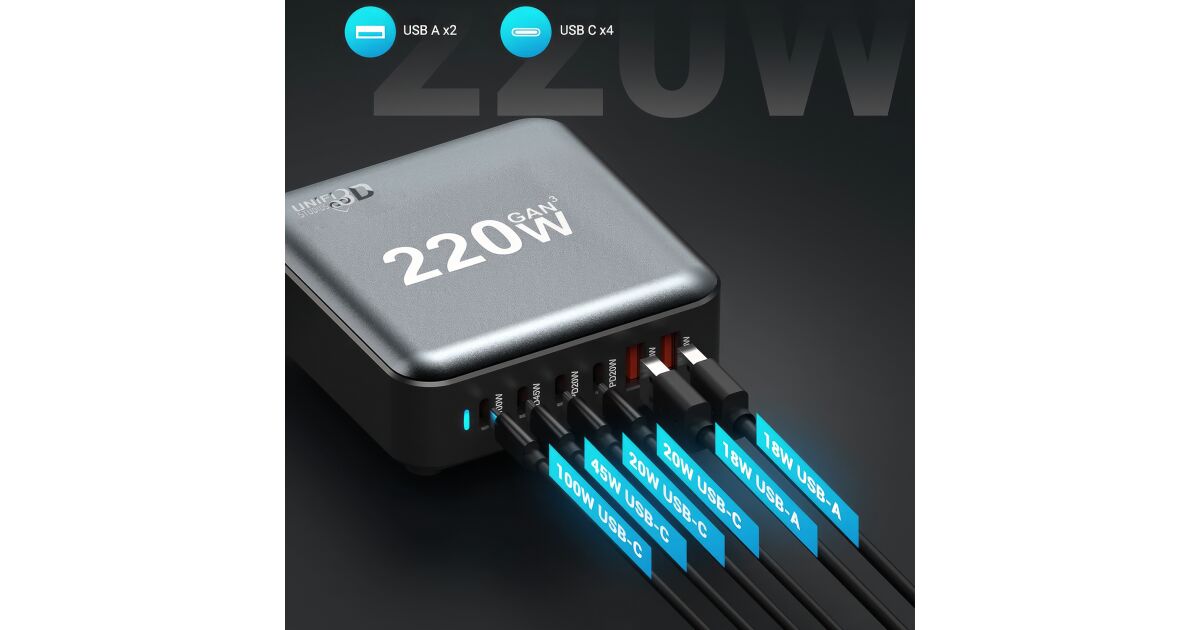 6-в-1 зарядна станция GaN III – 220W, 4x USB-C + 2x USB-A | Едновременно зареждане на лаптоп и телефон | Съвместим с MacBook, таблети, смартфони | Черен описание на...