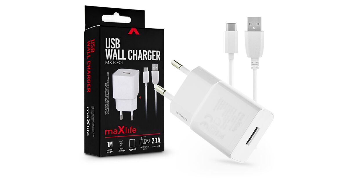 Мрежово зарядно устройство Maxlife, MXTC-01, 1x USB 2.1A, USB-C кабел, Бял (TF-0100)