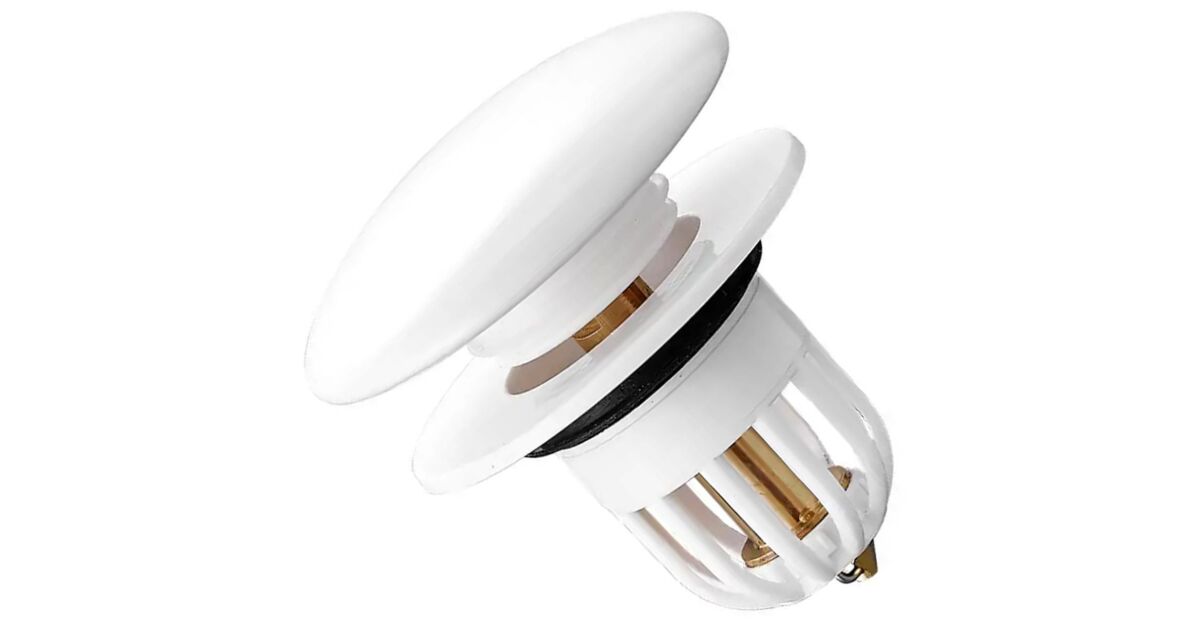 Abflussstopfen für Waschbecken, universell, Klicköffnung, Stahlmaterial, Außendurchmesser 66 mm, Farbe weiß Beschreibung