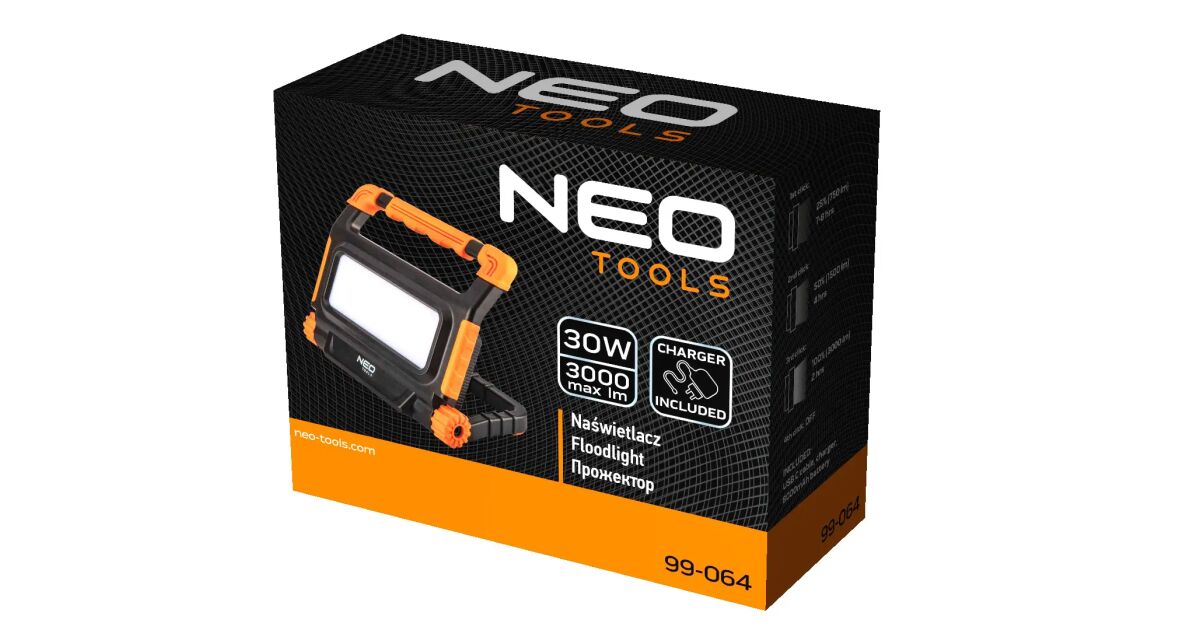 -Neo Tools 99-064 Wiederaufladbarer Scheinwerfer, Standfuß, wiederaufladbar, 3000lm smd led, Schwarz/Orange Beschreibung