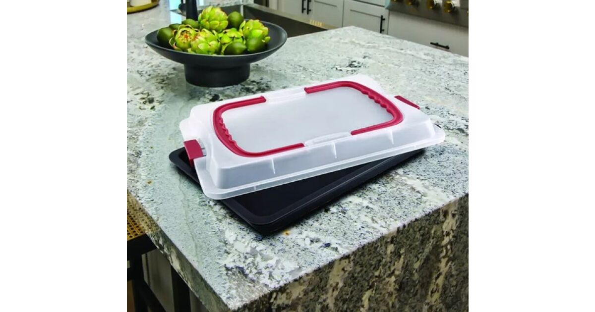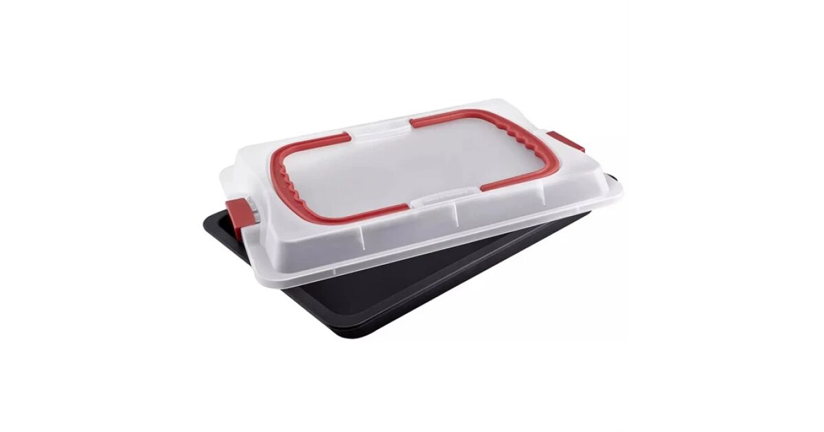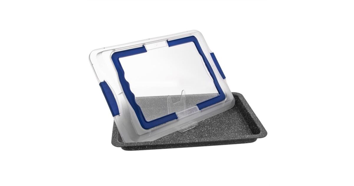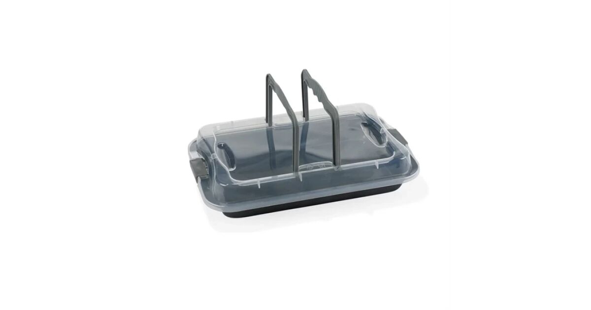 Tragbares 2-in-1-Backblech und Serviertablett – großes Backblech mit transparentem Kunststoffdeckel – 42 x 28,5 x 4,5 cm