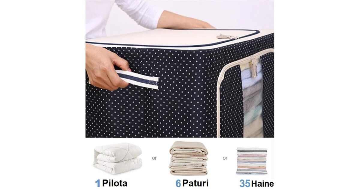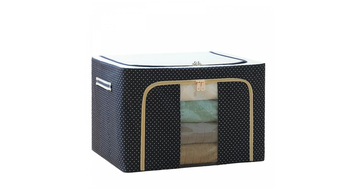 Faltbare Aufbewahrungsbox, Flippy, mit Reißverschluss, 100 L, Textil, 60x42x40 cm, Marineblau, Metallrahmen, stabiler Kunststoff-Bodenträger, Punktedruck Beschreibung