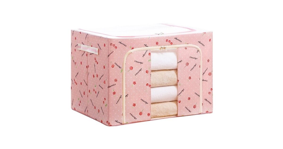Faltbare Aufbewahrungsbox, Flippy, mit Reißverschluss, 100 L, Textil, 60x42x40 cm, mit Fenster, Metallrahmen, stabiler Kunststoff-Bodenträger, Kirschdruck, Pink Beschreibung