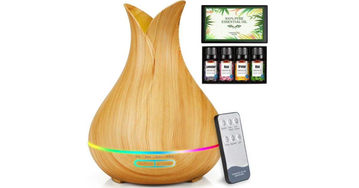 Ultraschall-Aromatherapie-Diffusor in Vasenform und 4-teiliges Pulaiyi-Set mit ätherischen Ölen – Helles Holz
