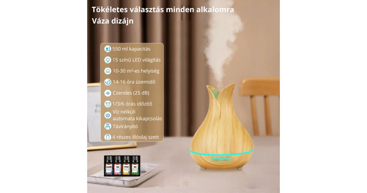 Ultraschall-Aromatherapie-Diffusor in Vasenform und 4-teiliges Pulaiyi-Set mit ätherischen Ölen – Helles Holz Beschreibung