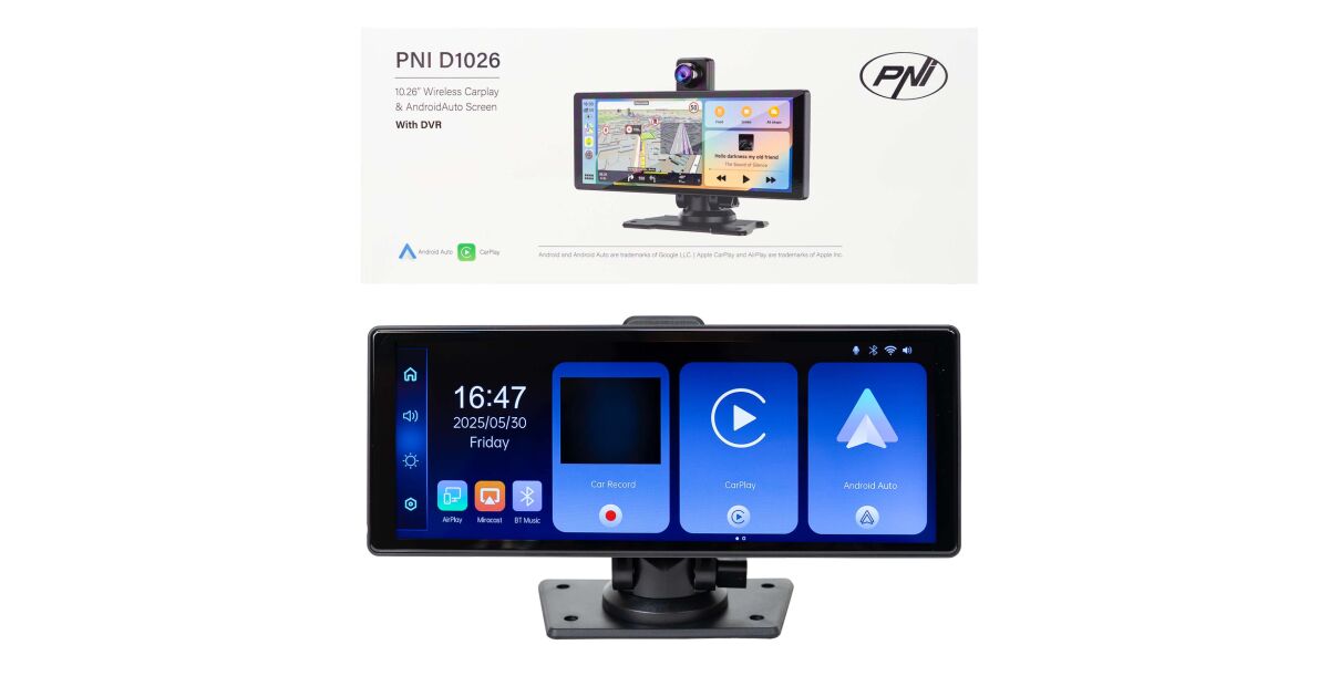 Auto-Monitor mit DVR PNI D1026 10,26 Zoll, drahtloses Carplay, Navigation, Musik, Freisprecheinrichtung, Bluetooth, FM-Transmitter