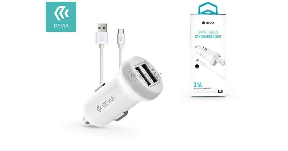 Devia Dual-USB-Zigarettenanzünder-Ladeadapter + Typ-C-Datenkabel mit 1 m Kabel – 5 V/3,1 A – Devia Smart Series Autoladegerät-Anzug – Weiß Beschreibung