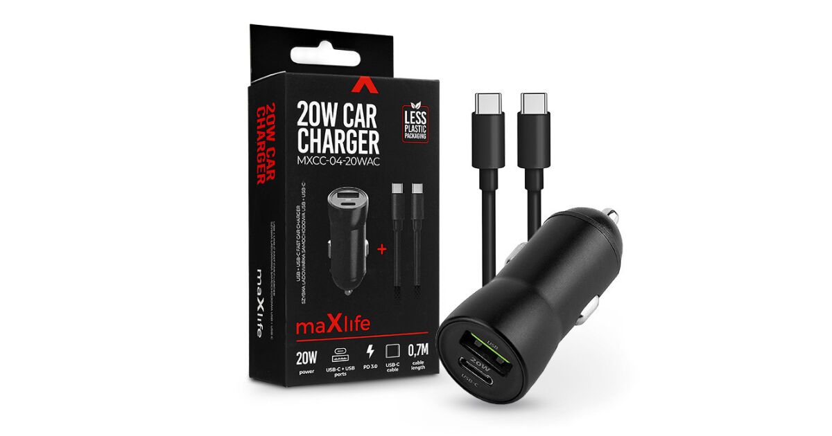 Maxlife Zigarettenanzünder-Ladeadapter mit USB + Typ-C-Eingang + Typ-C – Typ-C-Kabel – 20 W – Maxlife MXCC-04-20WAC PD3.0 + QC3.0 Autoladegerät – Schwarz