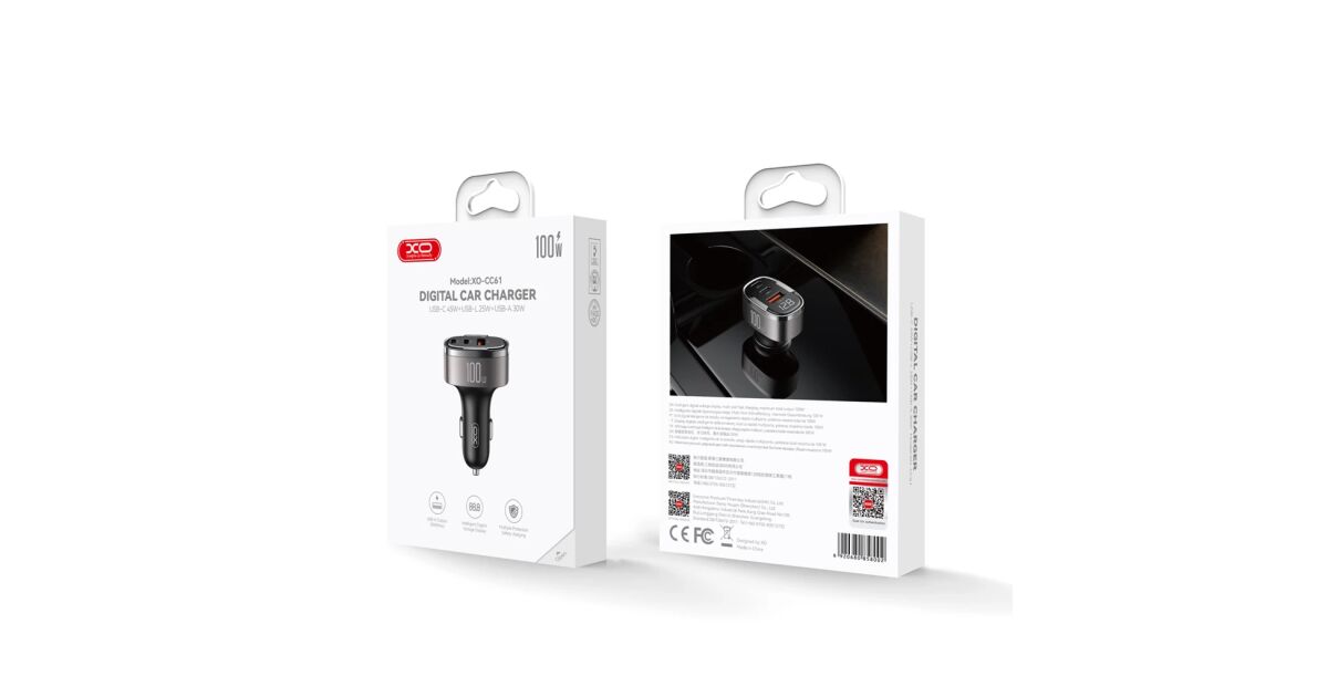 XO CC61 Graues Autoladegerät 100 W PD QC 3.0 – 1 Stück USB-C + 1 Stück USB-A + 1 Stück mit Lightning-Buchse
