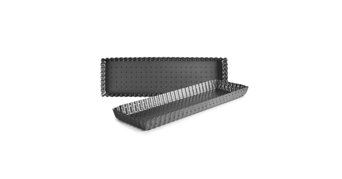Diese perforierte, rechteckige Backform ist aus hochwertigem Stahl gefertigt und hat eine doppelte Whitford Xylan Antihaftbeschichtung. Ideal zum Backen von Kuchen, Quiches und anderen Leckereien.