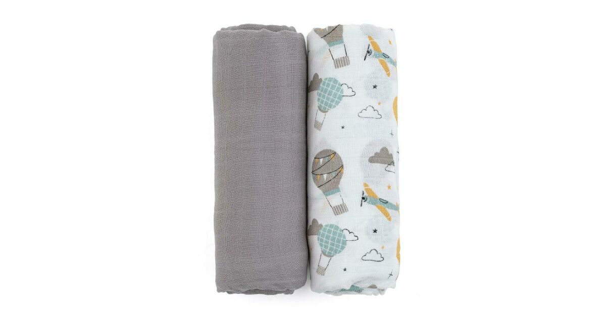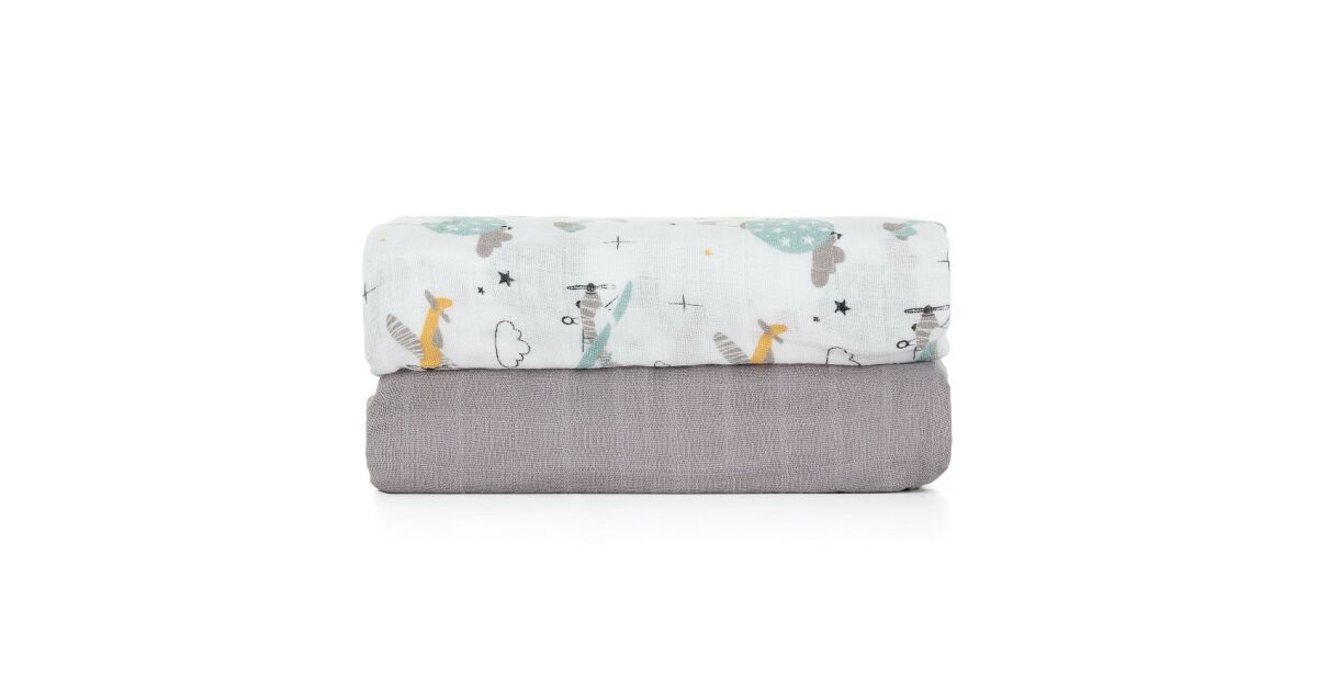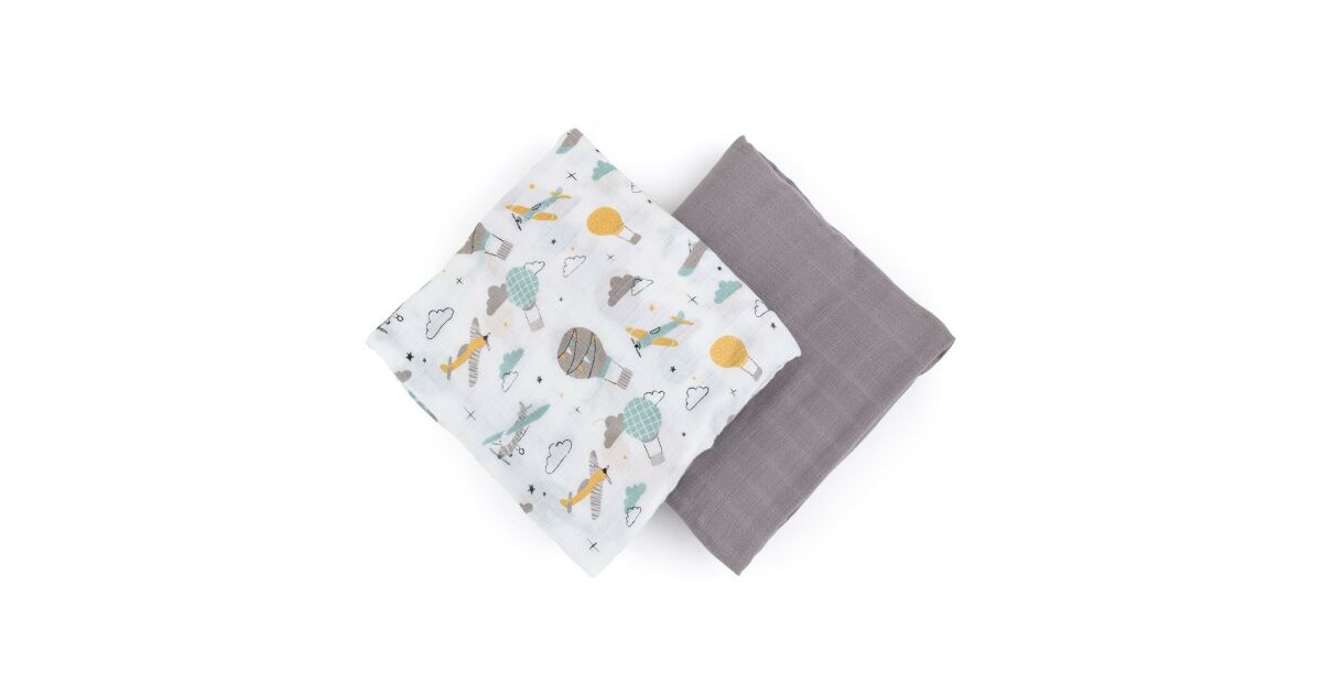 Das Set beinhaltet: 2 Stück 120x120 cm Bambus-Musselin-Tücher (1 grau, 1 mit Flugzeugmuster)