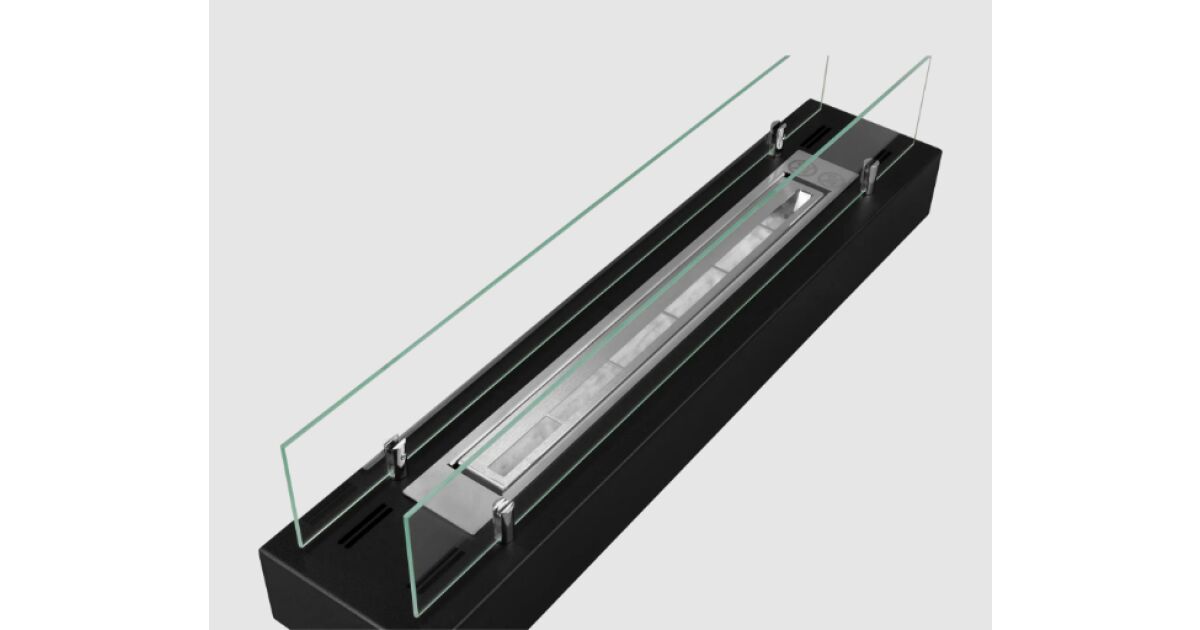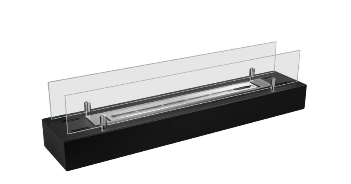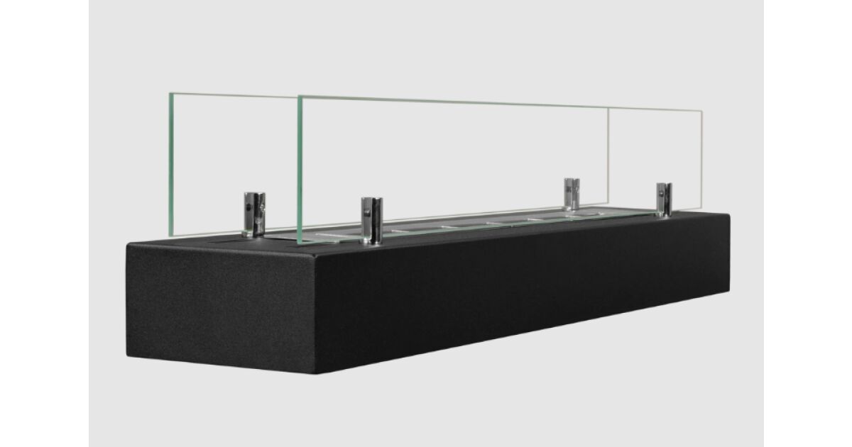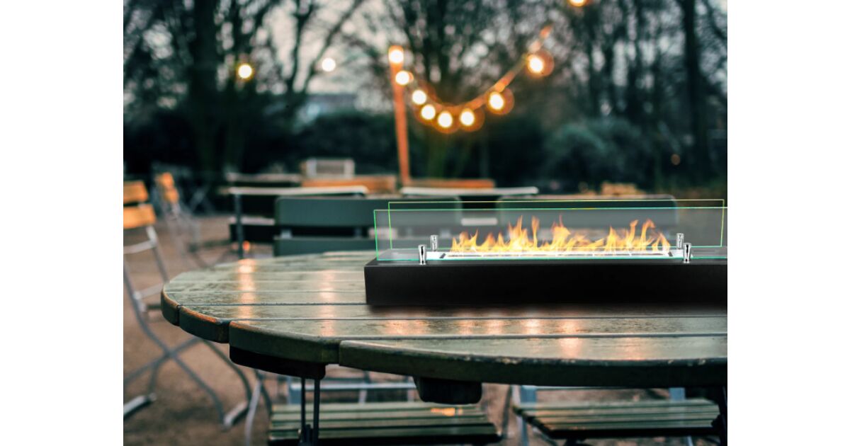 Bioethanol-Kamin 70 x 14,4 x 16,7 cm – Mattschwarz, 2-kW-Edelstahlbrenner, hitzebeständiges Glas, inklusive Trichter und weißen Kieselsteinen | Für drinnen und draußen – Elegantes Design für Zuhause, Terrasse oder Restaurant Beschreibung
