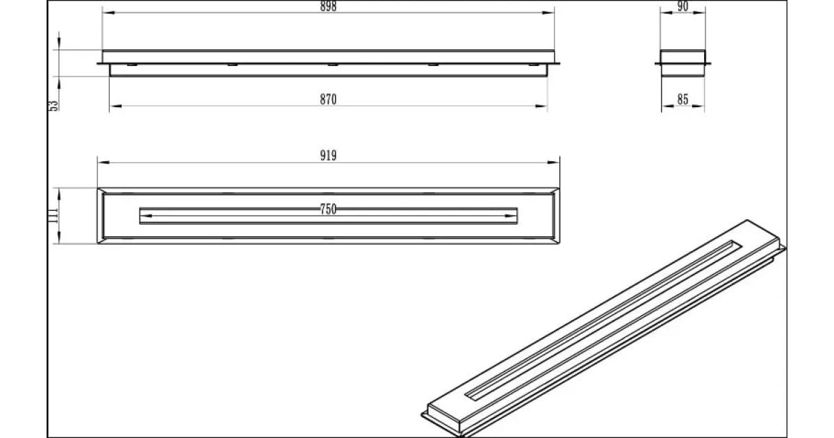 Bioethanolbrenner / Bioethanolkamin Linear INSERT 900 x 110 x 53 mm, Einbau, aus Edelstahl, mit weißen Kieselsteinen, Trichter und Aromaschale! Beschreibung