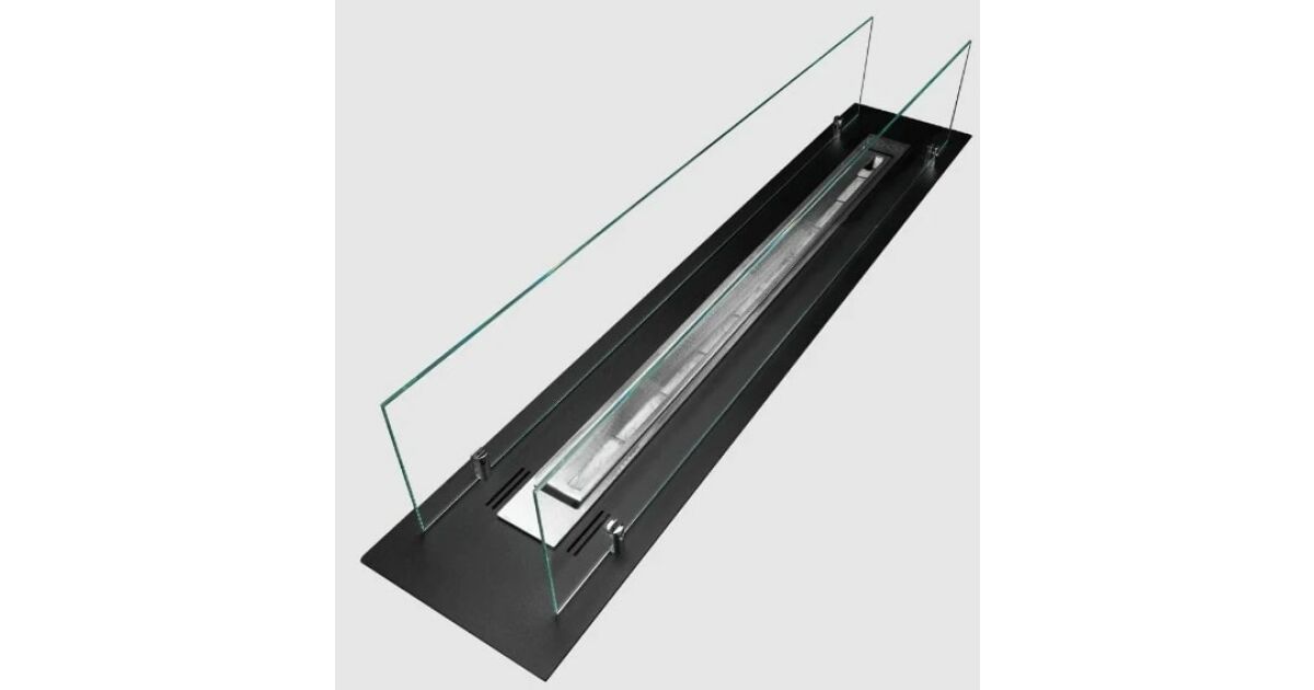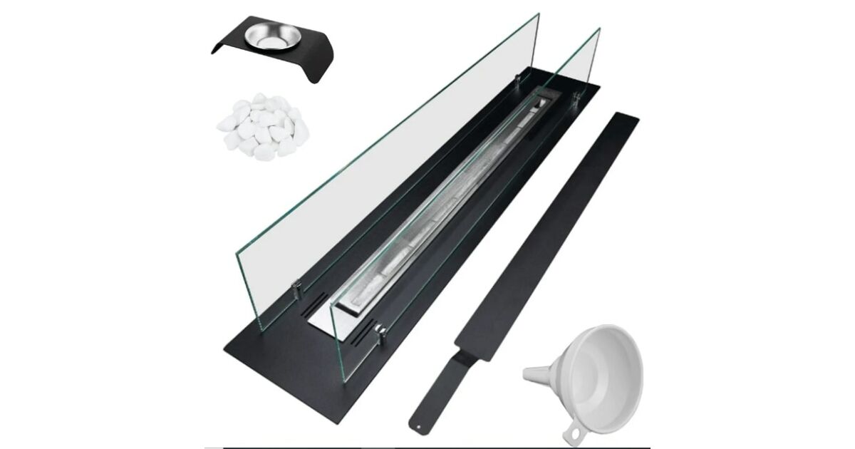 Eingebauter Biokamin / Bioethanolbrenner EINSATZ 100 cm mit mattschwarzem hitzebeständigem Glas, 99 x 21 x 21 cm, dekorativen weißen Kieselsteinen, Trichter und Aromatherapiebehälter! Beschreibung