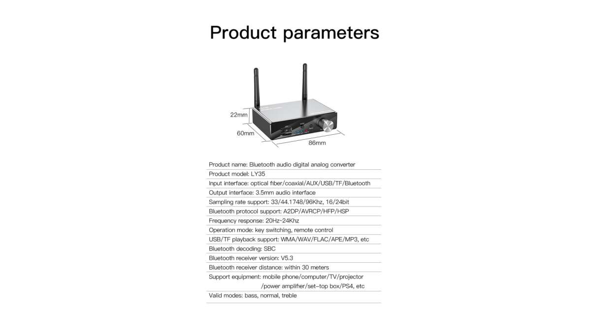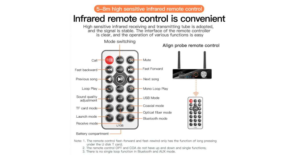 - 6-in-1-Funktion: Bluetooth Sender/Empfänger, DAC-Wandler, USB/TF-Kartenwiedergabe, mit Fernbedienung.