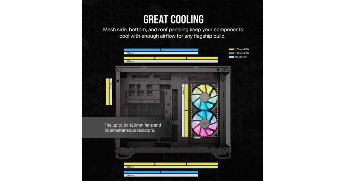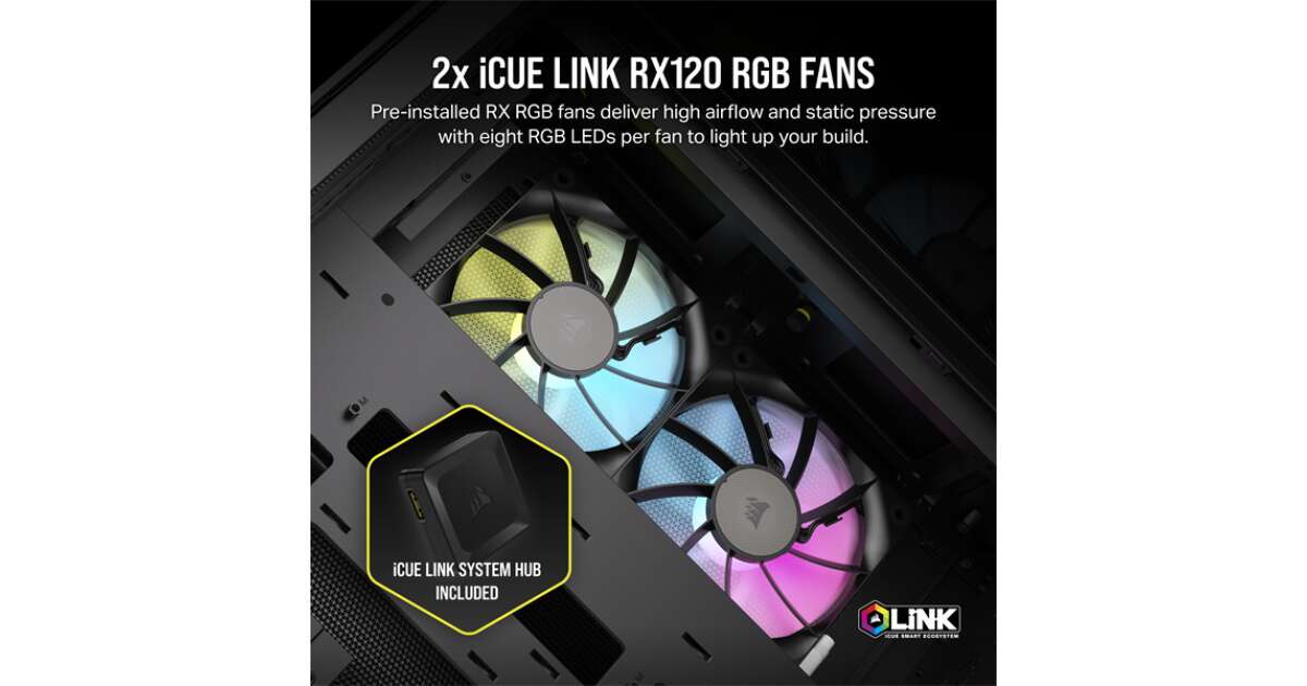 - RGB-Beleuchtung: Die beiden vorinstallierten iCUE Link RX120 RGB Lüfter liefern eine beeindruckende RGB-Beleuchtung, die du mit der Corsair iCUE Software individuell anpassen kannst. Kreiere deinen eigenen einzigartigen Style! 🌈