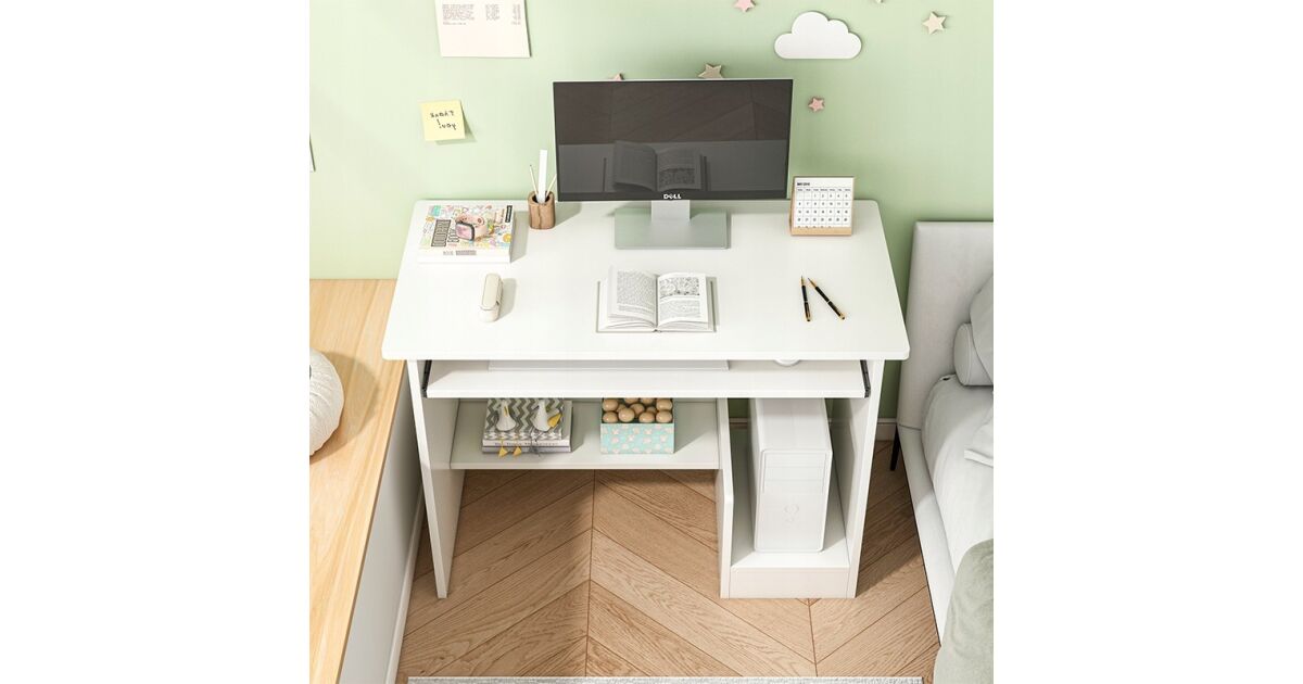Dieser weiße Schreibtisch ist die perfekte Wahl für ein modernes Homeoffice oder ein Studentenzimmer. Dank seiner kompakten Größe passt er auch in kleine Räume und bietet dennoch ausreichend Platz zum Arbeiten und Lernen. Die eingebauten Regale und die ausziehbare Tastaturablage bieten praktische Aufbewahrungslösungen.