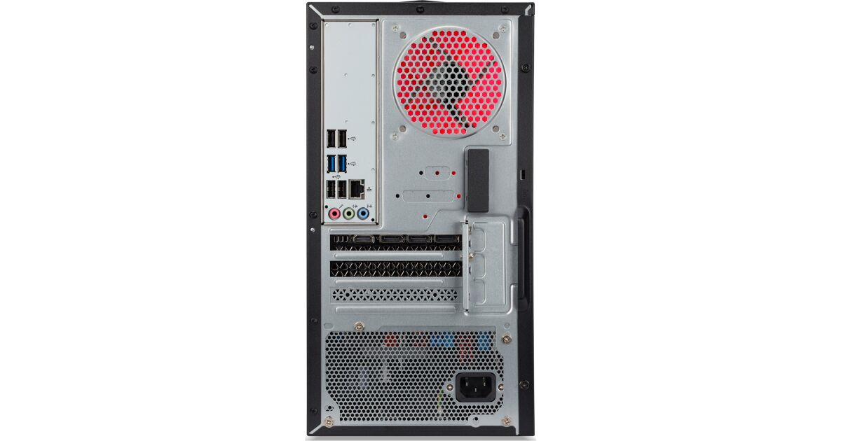 - Modernes Design: Das stilvolle schwarze Gehäuse mit roten Elementen unterstreicht den Gaming-Charakter des PCs.