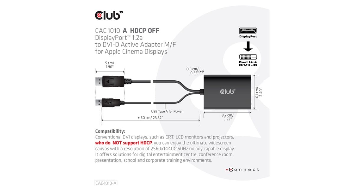 Ada club3d displayport zu dual link dvi-d hdcp aus version aktiv adapter m/w - für apple cinema displays Beschreibung