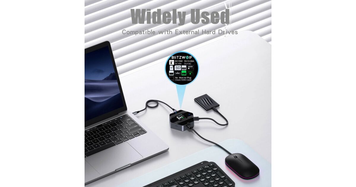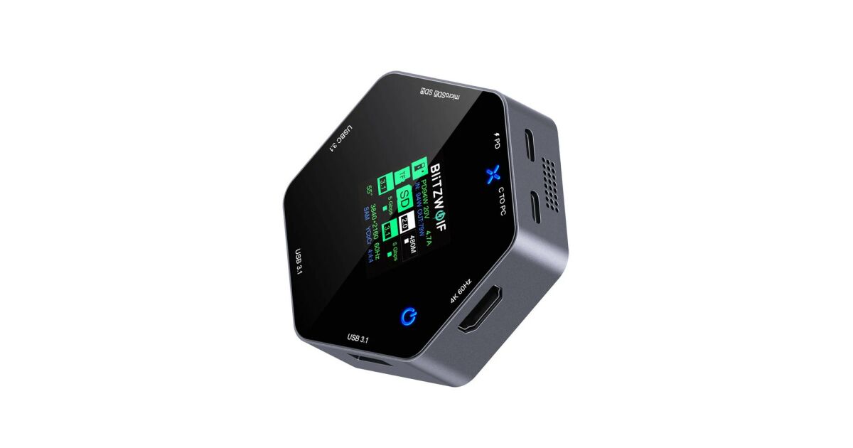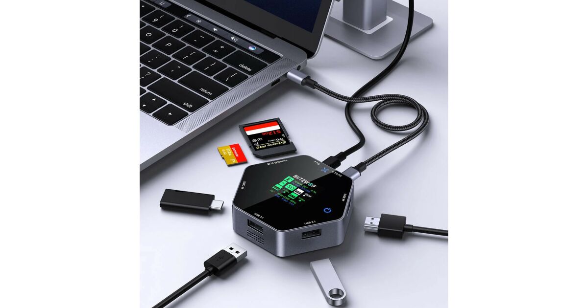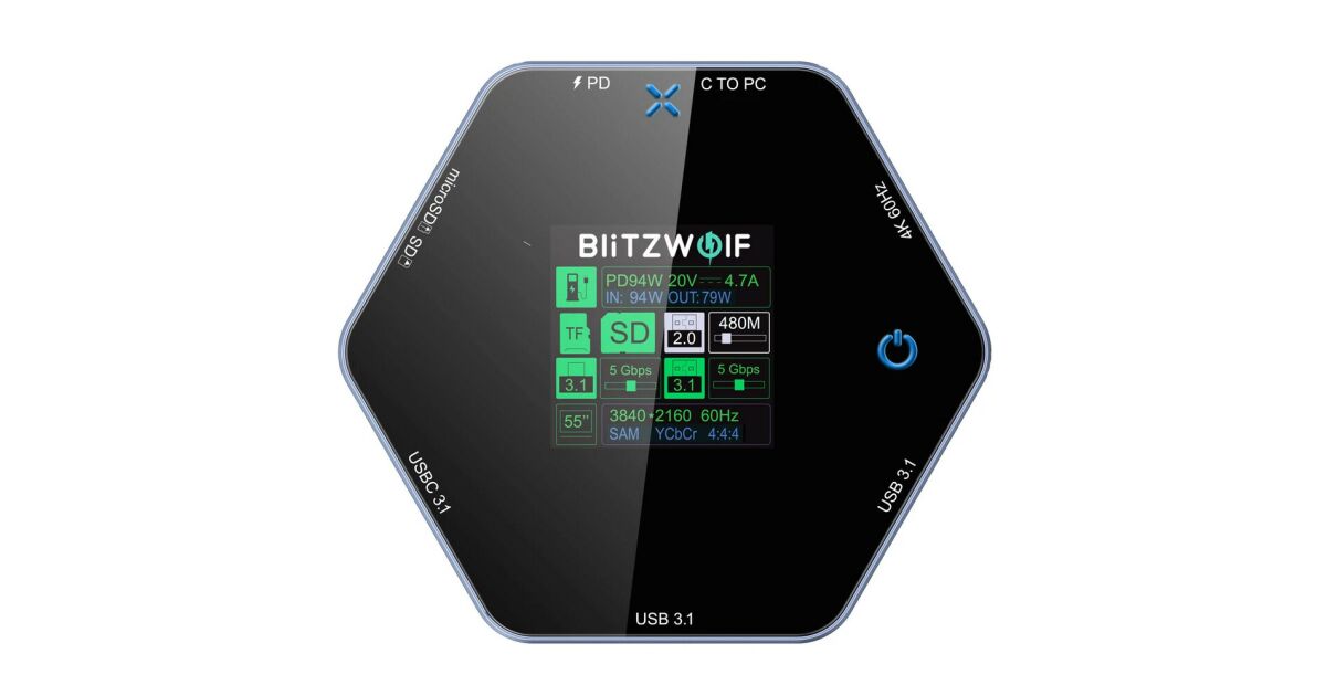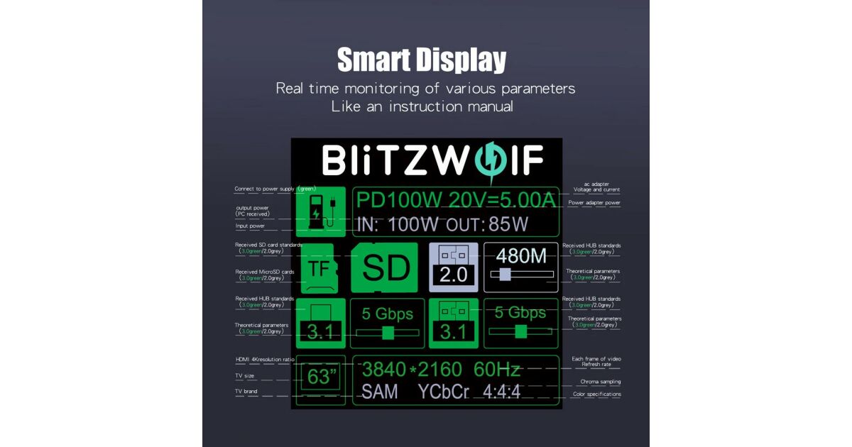 Blitzwolf BW-TH16 USB HUB-Dockingstation: LCD-Display, Typ C, USB 3.1 Typ C 3.1, HDMI 4K@60Hz, SD/TF-Kartensteckplätze, 100 W PD Beschreibung