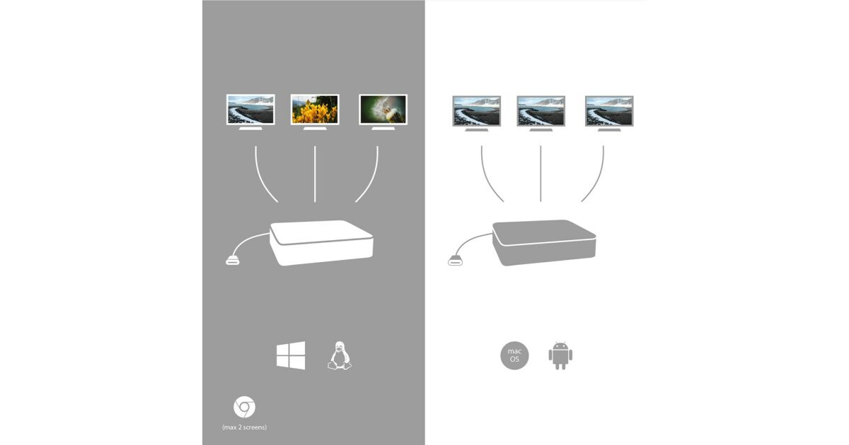- 🖥️ Unterstützung für drei Monitore: Mit DisplayPort-, HDMI- und VGA-Ausgängen können bis zu drei externe Monitore angeschlossen werden (bis zu 4K/30Hz). Unter macOS wird nur eine erweiterte Anzeige unterstützt.