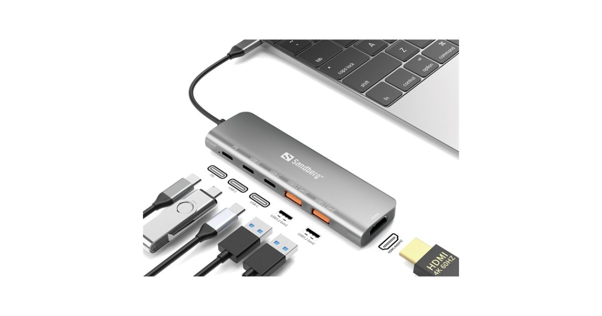 Sandberg USB-C Dock HDMI + 2xUSB-A + 2xUSB-C + PD100W Verkabeltes USB 3.2 Gen 1 (3.1 Gen 1) Typ-C Aluminium